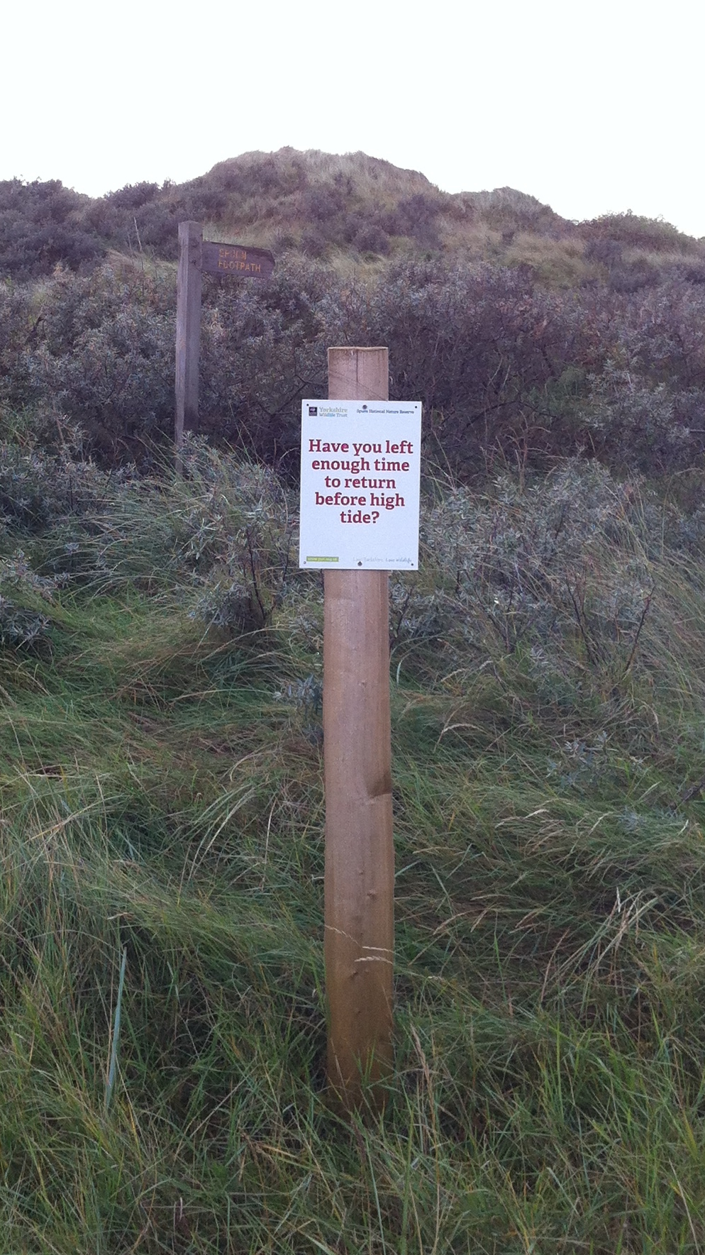 Formed from sand and shingle washed southward from the Yorkshire coast and clay from Flamborough Head that is deposited in the calmer waters at the mouth of the Humber, the sands of the Spurn peninsula are always shifting. The entire area is moving gradually westwards. It is part of a civil parish called Easington, which has lost many villages to the sea over the centuries. There must be lots of ‘and their church bells can be still heard to this day, ringing under the waves,’ folklore around this area. The walk to the tip of Spurn Head and back is almost 10k, and the rain kindly decides to give us a break for entire kilometres at a time. As we set off it’s nearly four and already beginning to get dark, and the path is littered with signs demanding to know whether we have left enough time to return before high tide. Although there isn’t a high tide in sight, they make me nervous nevertheless. The first sign I think is helpful. By the fifth, I am detecting a snippy tone in the question mark. ‘Have we?’ I ask Nick. ‘I guess we’ll find out,’ he replies. There is even a shelter for people caught in high tide to wait in, and as I’m puzzling over the logistics of being trapped in a small wooden hut with waves rising outside its crickety door, Nick patiently explains that the shelter – the clue being in the name – is in a place that doesn’t get exposed to the water at high tide.