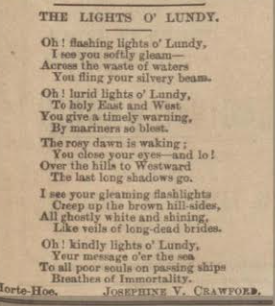 But what of his daughter? Josephine seems to have ping-ponged from Ireland to England and back for decades. The 1881 census records her as a pupil teacher in Kent, by 1889 she’s in Dublin and marrying Joseph Crawford, a clerk from Rathmines. There is no sign of her in the Irish census of 1901, but in 1911, the UK census finds her aged 50, married for 21 years and without children, alone in lodgings in Twickenham. She lists her occupation as ‘lyrical writer and journalist (unattached).’ I presume that unattached means what we would now call freelance, rather a reference to her solitary status on census night. Not long before that, in December 1910, her poem The Lights O’ Lundy was published in the North Devon Journal. This poem isn’t up to much in my opinion, so I have decided to believe it’s just a piece of its time, and shouldn’t be subjected to too harsh a contemporary scrutiny. Lundy is a island in the Bristol Channel, twelve miles from the Devon coast. These days, it is permanent home to about twenty people. I came across it – so to speak – during my exploration of the Shipping Forecast as part of the Maeve Binchy Travel Award. Her poem has a Macushla-lite quality to it: ‘Oh! flashing lights o’ Lundy/ I see you softly gleam-/ Across the waster of waters,/ You fling your silvery beam.’ It continues in that vein for some time, as you can see.