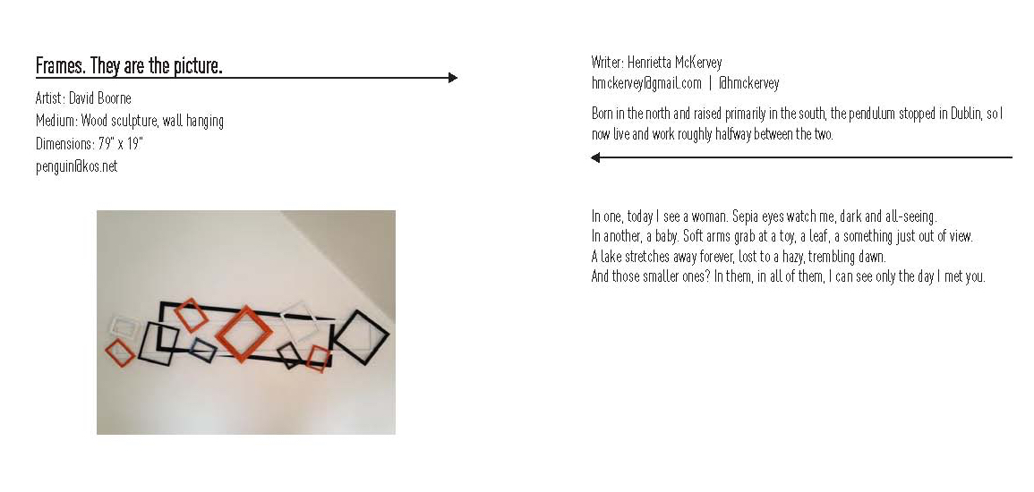 26 Atlantic Crossings was a collaborative exhibition between 26 visual artists from Prince Edward County in Ontario, Canada, and 26 writers from Ireland and the UK, who ‘gave voice’ to a piece of their artwork in the form of a sestude. (It was new to me too: John Simmons’ invention, a sestude is a piece of writing with exactly 62 words, i.e. 26 in reflection). The this-side-of-the-Atlantic bit was organised by John and Faye Sharpe. My editor was Tom Collins. I was paired with artist David Boorne, who lives with his wife on a farm in Prince Edward County, 300k in from Toronto. The farmhouse dates from the 1880’s, which as Dave said himself, is an old house by Canadian standards. His artwork was a sculptural series of frames, itself forming one long framed piece. I loved the idea of the frame being the content itself, and I wrote a piece about the imaginary pictures that may once have inhabited each. One of the many things I enjoy about 26 projects